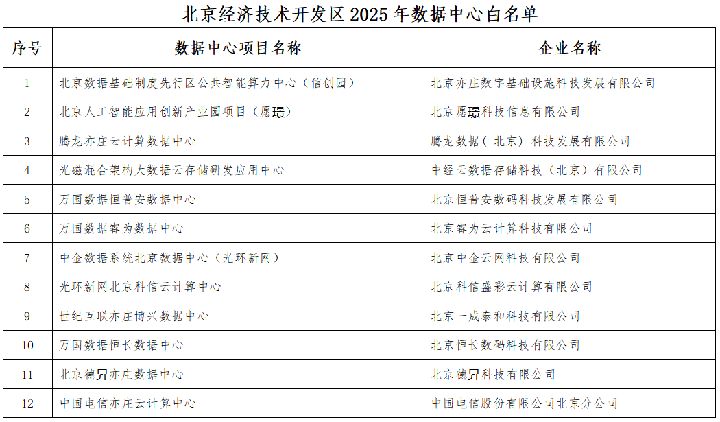 世纪互联、光环新网、万国数据等12个项目入选!北京经开区2025数据中心白名单揭晓